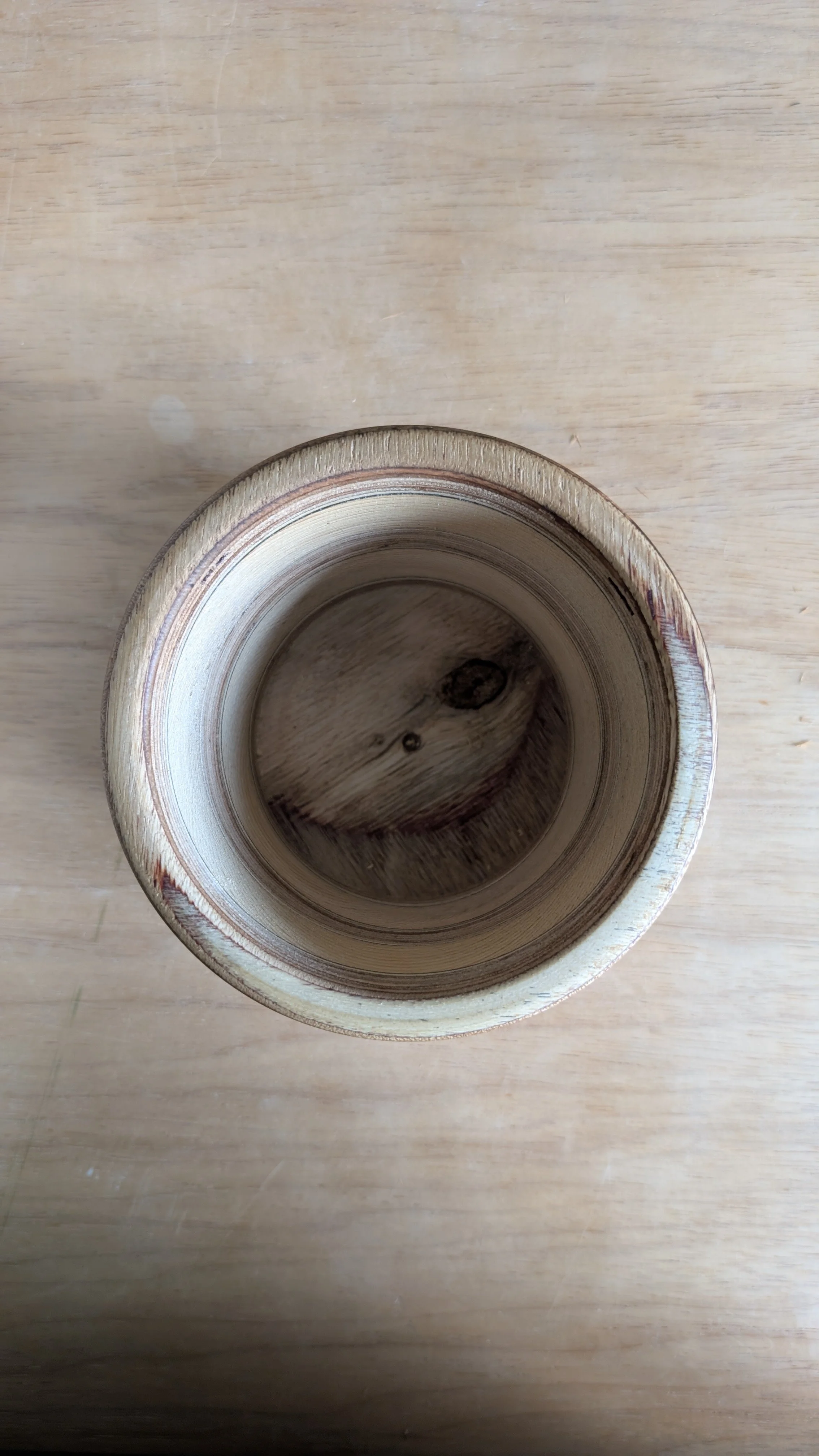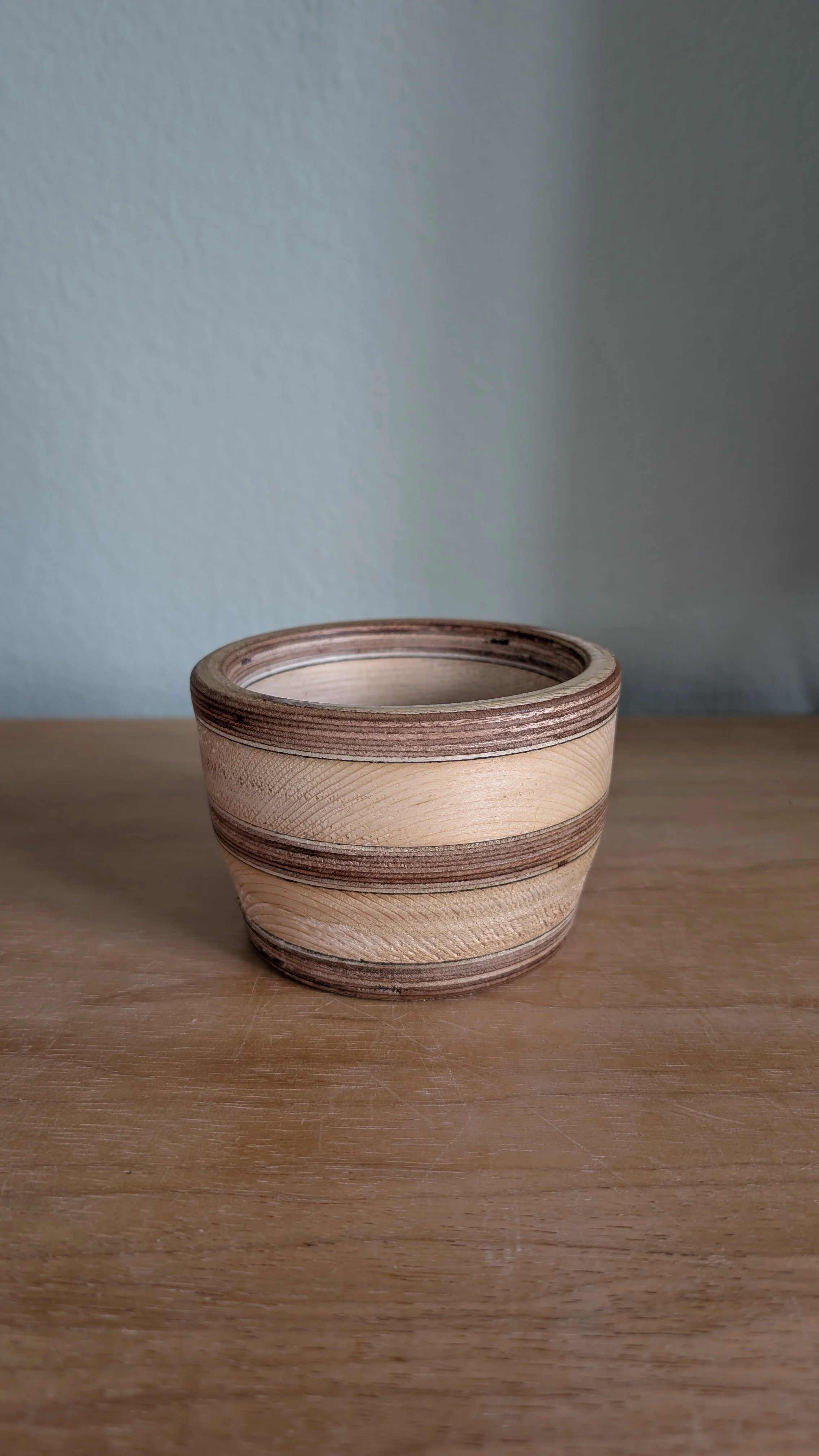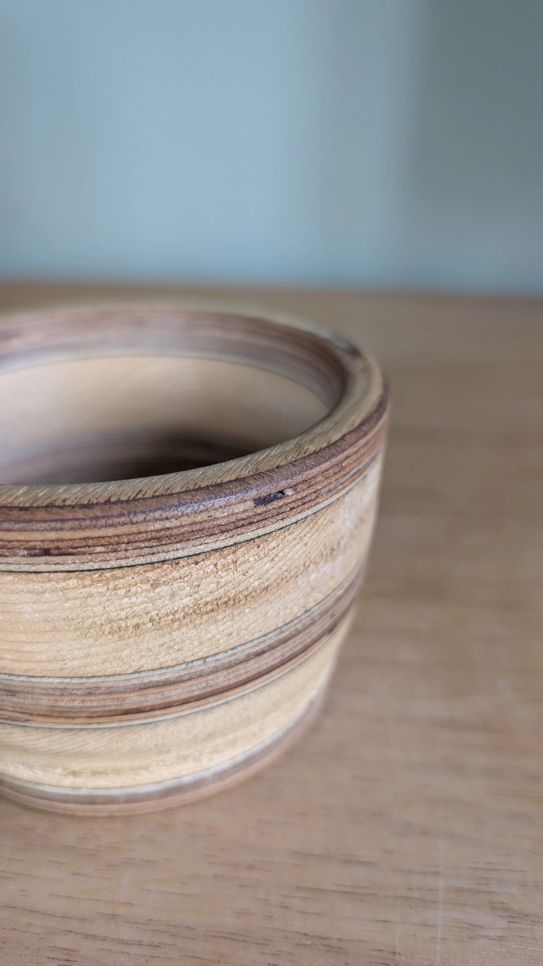 Handgedrechselt aus geklebtem Holz mit auffälligem Streifenmuster. Die hellen und dunklen Holzschichten wechseln sich ab und bilden einen natürlichen Rhythmus. Geölt und geschliffen, liegt die Schale ruhig in der Hand.