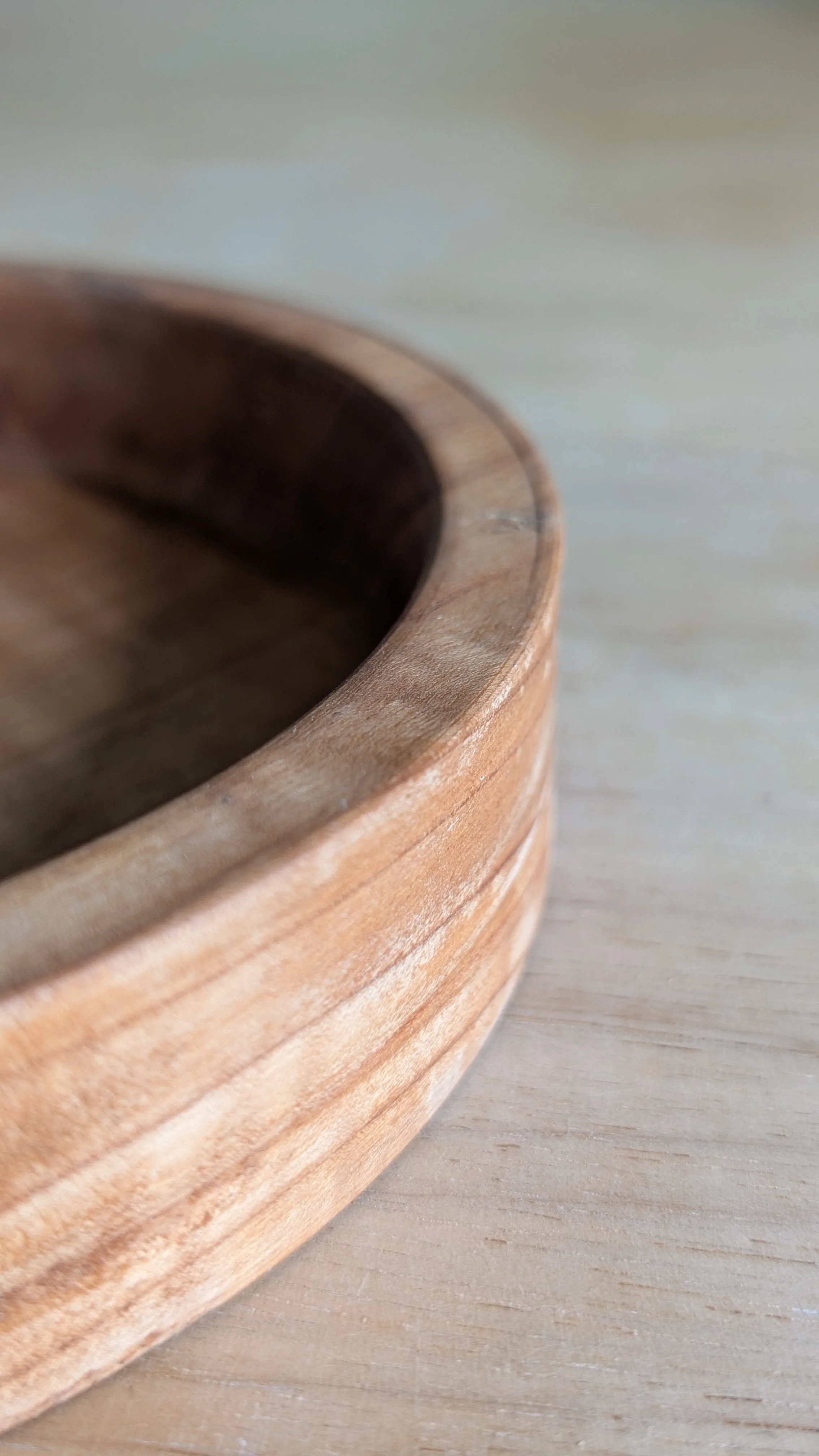 Handgedrechselt aus massivem Holz. Die Maserung erzählt vom Baum, die feinen Drechselspuren von der Arbeit. Jeder Teller ist ein Unikat.